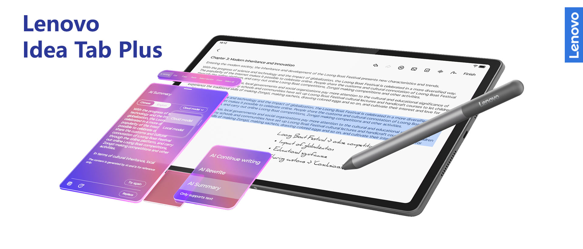 聯想 AI 智慧筆記輔助 – 透過 AI 技術實現自動續寫、改寫和摘要功能,幫助用戶流暢記錄靈感、高效學習與創作。